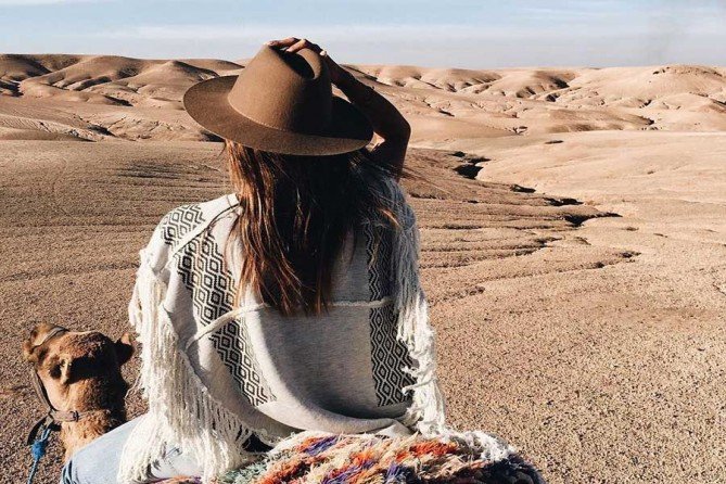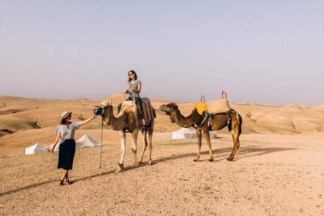 Agafay one Day Desert Trip If you are looking for a quiet and calm escape from the bustle of Marrakech, Agafay one Day Desert Trip is the perfect place. The tour starts in the late afternoon, after only 45 minutes driving from Marrakech you will be able to enjoy the calm and serenity of the arid landscapes made of stones and rocks. At the sunset, you will enjoy one hour ride on a camel through the rocky desert of Agafay with the high Atlas in background. After that, you will be able to taste a typical Moroccan dinner under a sky-full of stars. The meal includes a starter, a main course, a dessert and mint tea. At the end of the tour, you will be transferred back to your Hotel / Riad in Marrakech.